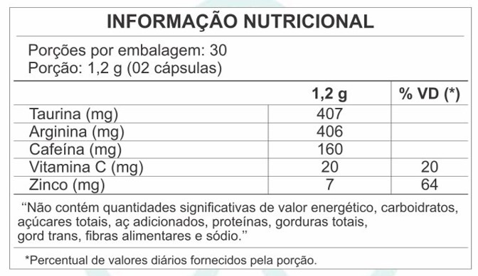 Taurina, L-Arginina, Cafeína/ 1, 3, 7-trimethylxanthine, Guaraná em Pó (Paulinia cupana), Bisglicinato de Zinco, Ácido Ascórbico (Vitamina C) e Antiumectante Dióxido de Silício.